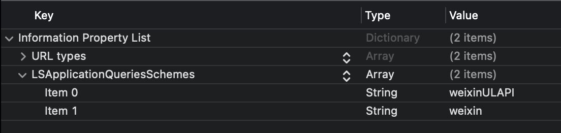 Öffne schließlich deine Info.plist und füge weixinULAPI und weixin unter LSApplicationQueriesSchemes hinzu.