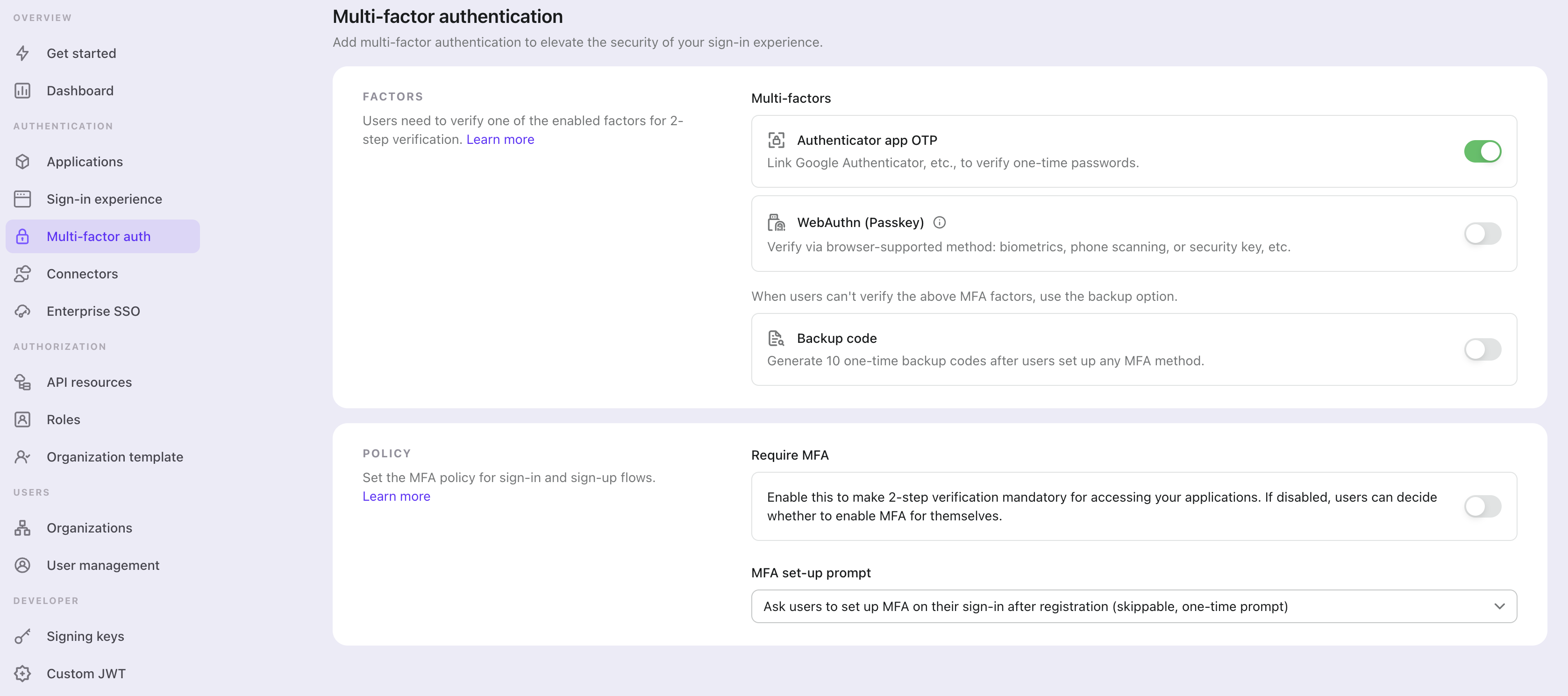 Suivez ces étapes pour activer les MFA dans le flux de connexion des utilisateurs de Logto :