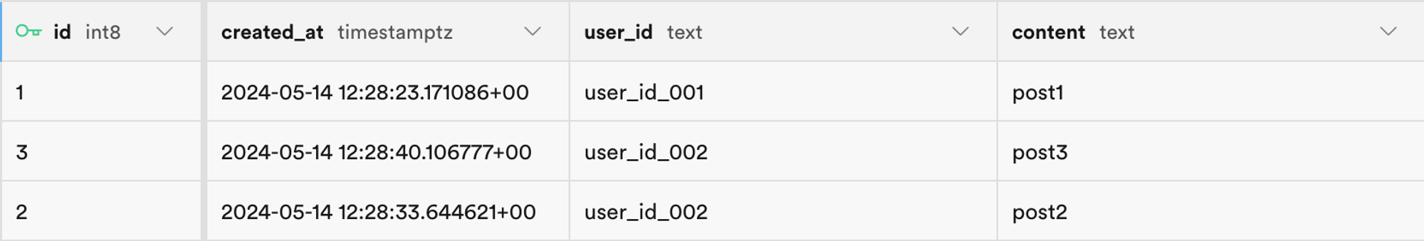 テーブル内の user_id フィールドは、各投稿データが属するユーザーを表しています。user_id フィールドに基づいて、各ユーザーが自分の投稿データにのみアクセスできるように制限できます。
