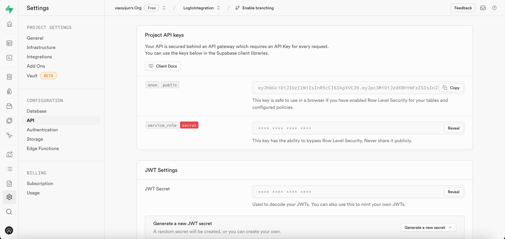 service_role シークレットは、JWT シークレットと同じページで見つけることができます: