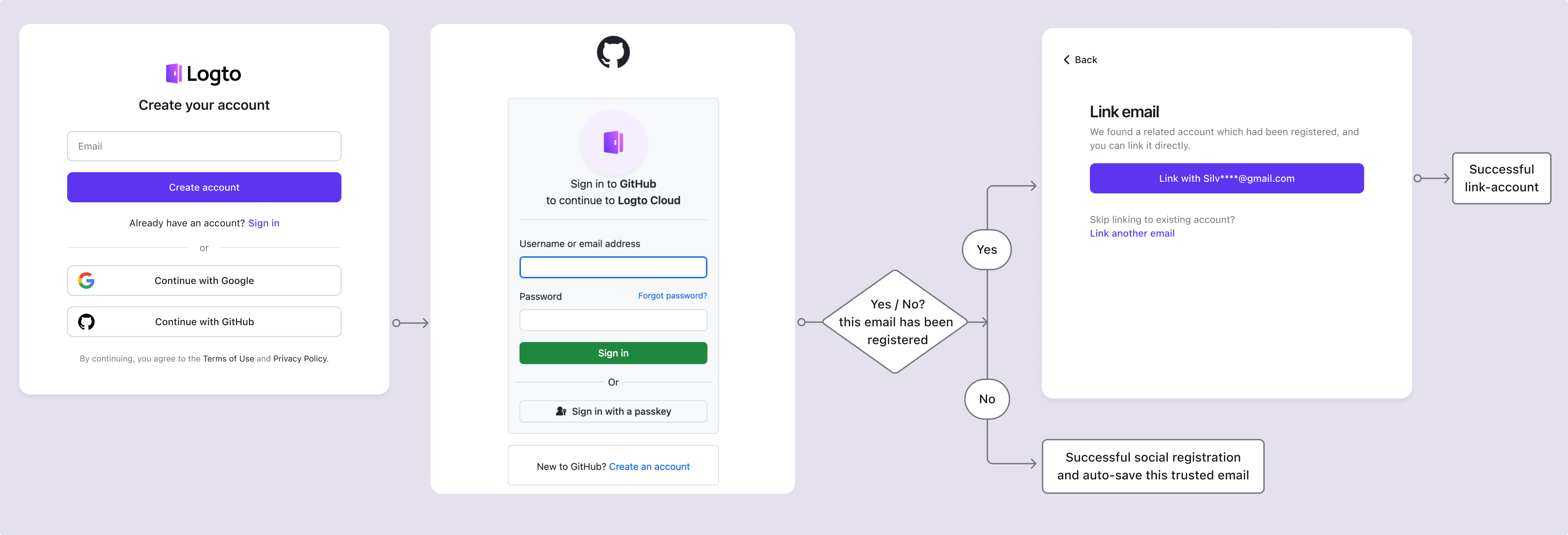 Se uma conta relacionada for localizada durante o processo de cadastro social com um email ou número de telefone que corresponda a uma conta existente, e o usuário optar por não vincular as contas, o email ou número de telefone não será sincronizado com a nova conta no Logto. Isso garante que o email e o número de telefone permaneçam únicos em todas as contas de usuário.